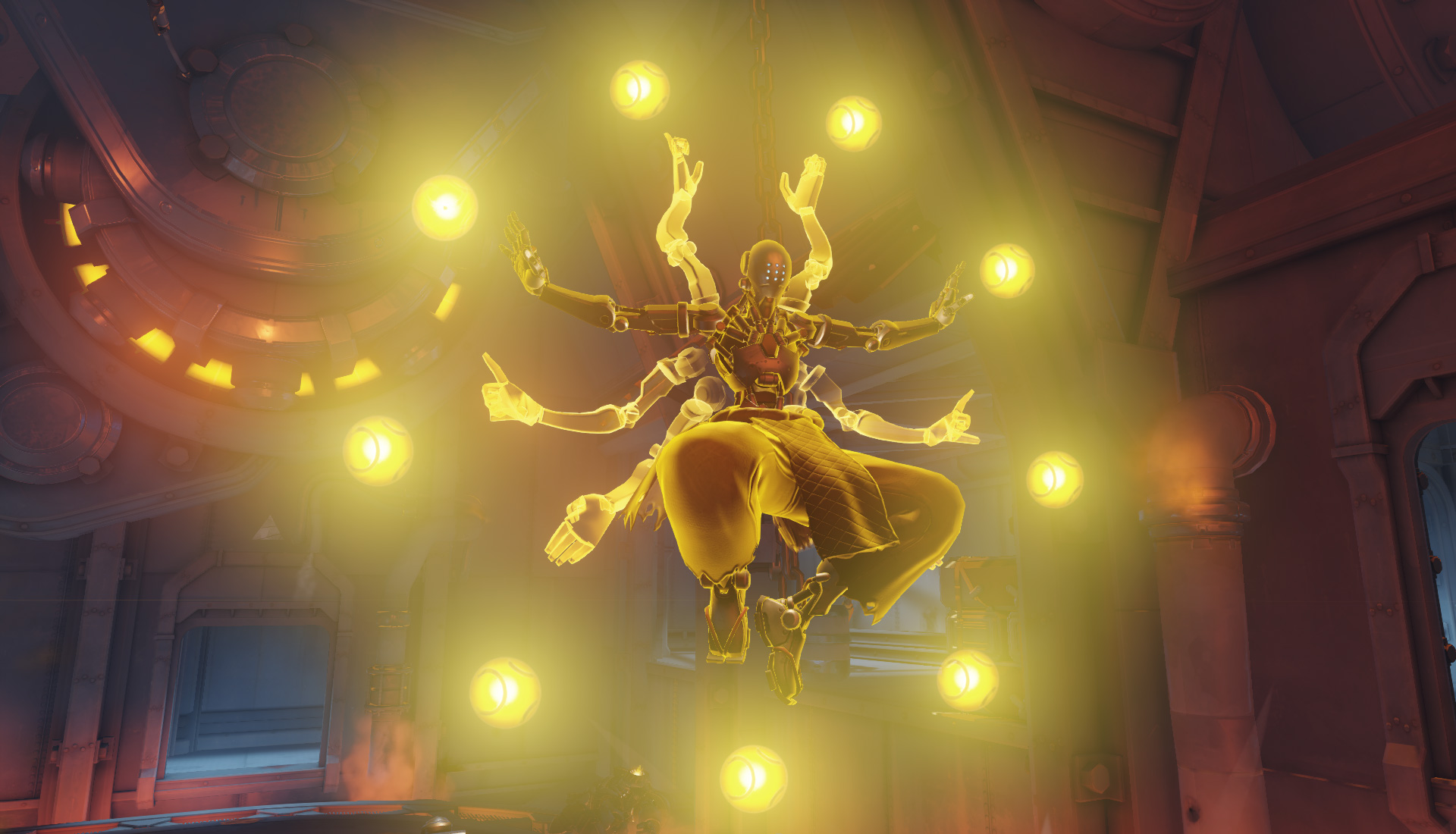 An image from the video game Overwatch depicting the hero Sigma performing a Gravitic Flux on the enemy team.